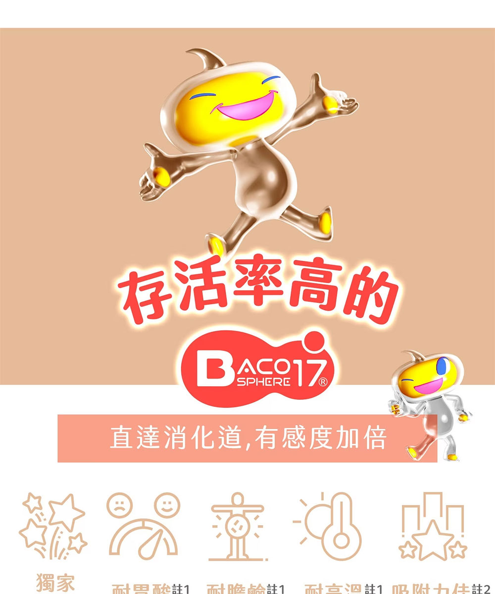 ◆ 獨家專利BACO17芽孢菌 通過強酸 存活菌數高達95%