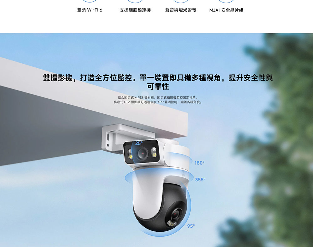 品牌:小米 型號:MJSXJ08HL 解析度:2560 x 1440 光圈:F/1.6 類型:有線 解析度:720P1080P 適用於:室外 功能:固定式廣角雙向語音雲端儲存支援記憶卡排程錄影移動追蹤 無線連接:Wi-Fi IEEE 802.11 b/g/n/a/ac/ax 2.4GHz/5GHz 防水等級:IP66 視訊編碼:H.265 相容於:Android 8.0 或 iOS 12.0 及以上版本 額定輸入:12V/1A 產品尺寸:189.6 x177.9x98.0mm 保固:12個月 BSMI:R39245 NCC:CCAH24LPA940T1 注意: ◆ 雲端儲存是付費功能,需要購買雲端儲存服務才能啟動。動態即時影片錄製等監控功能,需要雲端储存服務。 ◆ 包裝中未隨附MicroSD卡,使用者必須另行購買。建議使用認證製造商生產的MicroSD卡(16GB至256GB)。 ◆ 安裝或移除MicroSD卡後,需確定防塵蓋已蓋在卡托架上,以防止水進入產品並影響正常使用。 ◆ IP66防水等級表示產品可防止灰塵與水侵入,但不能浸入水中。 ◆ 隨附的電源轉換器不具備防水性能,電源轉換器僅限室內使用。 ◆ 請勿在過於潮濕或可能因水而造成損害的環境中使用本產品,例如蒸氣室或水中。 ◆ 使用延長線時,請確保連接埠有防水處理。 ◆ 為避免意外受傷,必須根據安裝指示將攝影機牢固地安裝於牆面。牆面必須能支撐至少攝影機三倍的總重量。 ◆ 部分功能需要手動啟用。 ◆ 纜線必須連接至電源,才能使用本產品。 ◆ 如果需要延長線,請選擇具有5.5x2.1mm DC插孔的延長線,適用於12V⎓1A電源供應器。 ◆ 本頁面上的比較影像僅供功能或效果說明之用。請以實際效果為準。 ※以上規格資料若有任何錯誤,以原廠所公佈資料為準 包裝內容: 攝影機 x1 電源供應器 x1 壁掛/天花板安裝模板貼紙 x1 電源線專用防水膠條 x1 螺絲配件組 x1 乙太網路連接埠防水四件組 x1 使用者手冊 x1 警告貼紙 x1 商品特色: ◆ 雙400萬像素鏡頭 ◆ AI聯動雙鏡頭 ◆ 智慧全彩夜視功能 ◆ IP66 防水防塵 ◆ AI人體與車輛偵測 ◆ 聲音與燈光警報